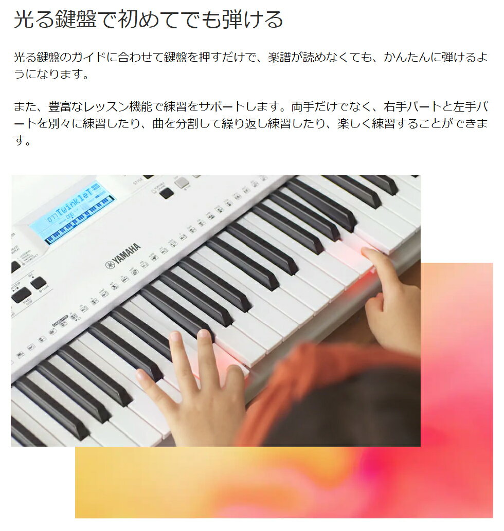 同じく鍵盤が光る、光ナビゲーション搭載で初心者でも演奏しやすくなっていますね。